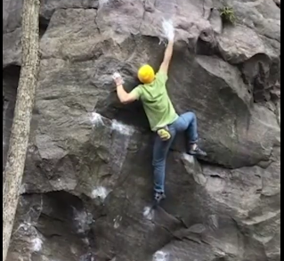 In the video, a climber in a yellow hat, green shirt, and blue jeans attempts to boulder a large rock face, aiming for a hold marked with a red star…